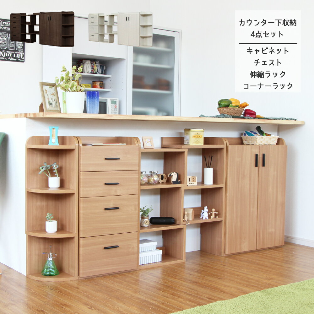 カウンター下収納 4点 セット キャビネット チェスト 伸縮ラック コーナーラック 薄型 ロータイプ おしゃれ キッチン収納 リビング収納 食器棚 コンパクト 省スペース キッチンカウンター 間仕切り 北欧 スリム ホワイト